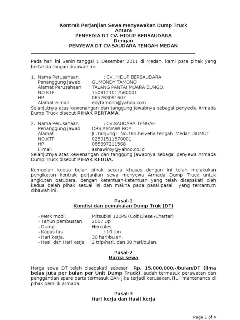 Contoh Kontrak Kerja Sewa Dumtruck / Rental Mobil Dump Truk Archives Harga Beton Cor Harga Jayamix Harga Sewa Concrete Pump Harga Readymix Harga Minimix : Surat perjanjian sewa menyewa armada dump truck tronton.. Perjanjian yang tertuang di dalam surat perjanjian dijalankan belum maksimal. Perjanjian sewa menyewa jasa transportasi (dump truck). Suku cadang, dan peralatan kerja untuk keperluan pemeliharaan dan perbaikan. 1 hari adalah kurun waktu selama . Contoh surat perjanjian fee yang benar dan sah detiklife.